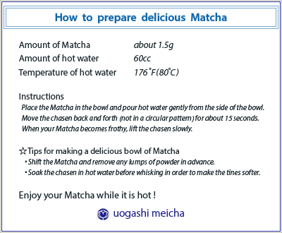 Matcha is a fine powdered green tea commonly used in sadou(the tea ceremony). The young tea leaves are shaded from direct sunlight and steamed in the same way as for gyokuro, then turned into tencha(non-ground leaves) by drying without rolling, and finally ground in a stone mill. Its elegant aroma and concentrated sweetness make matcha a sheer pleasure to drink, and as the powder is dissolved in hot water, all of the tea's beneficial nutrients can be taken in. Matcha is perfect for drawing out the flavors of Japanese confectionery and cuisine.